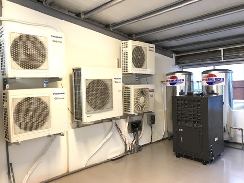 屏東車城「晴 陽光民宿」把自然風熱泵熱水器主機、壓力桶還有民宿房間冷氣的室外機全部放在頂樓遮蔽地方,相信能讓機器使用更加穩定。