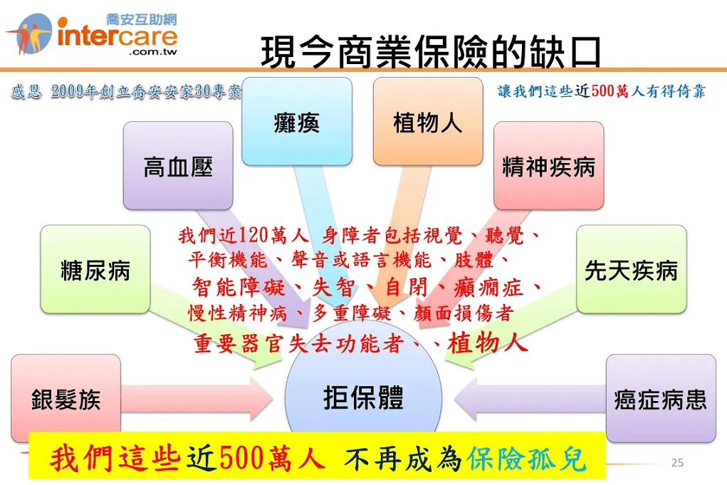 商業保險基於風險控管的原理,將高度風險的客戶排除在外,是必須捨棄的無奈。然而基於『互助保險』的概念,搭配『保險科技』創新的智慧,再加上多項金融科技創新的專利,讓『互助保險』得以實現,也讓『斜槓玩家』們多一項獨特的選擇。面對500萬無法投保的對象,不但與商業保險區隔明確、沒有市場競爭的顧慮,同時實現全民保險的理想,值得『斜槓玩家們』用心考慮。