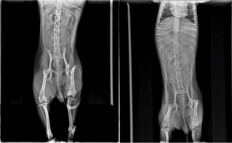 這天,主人帶著10個月大的約克夏幼犬『水水』來看診!一進門就看出跛腳的症狀,獸醫師看出『水水』不願用後腳走路,在拉伸左後腳時,髖關節發出骨頭的摩擦聲,其實在就診前,已經跛腳兩星期了。啄木鳥動物醫院馬上用X光檢查,發現股骨頭已經變型,而且股骨頸斷裂、骨折;果然是缺血導致的『壞死性髖關節炎』症狀。其實早在九月大時,就診斷出有潛在的發病危機。