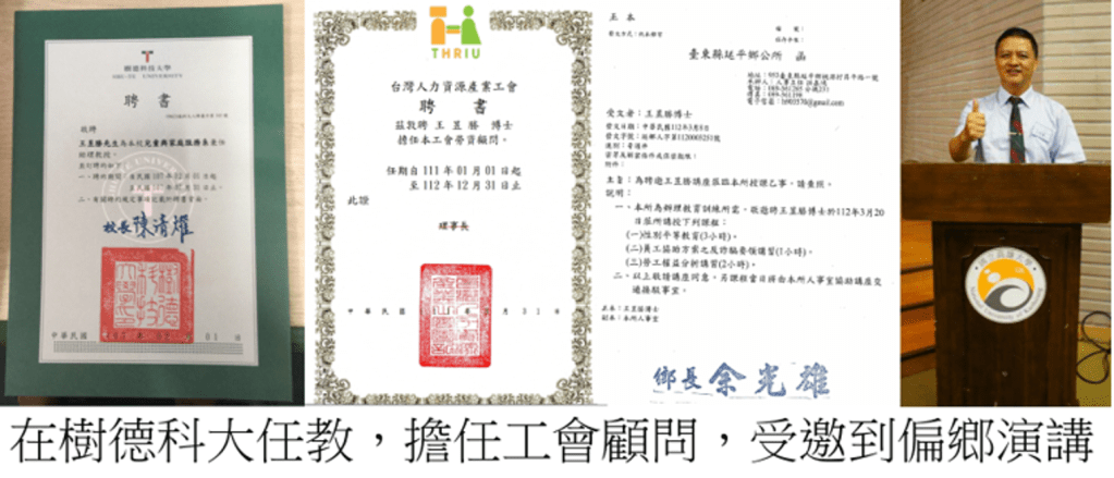 畢業於中央警察大學、警大研究所,中山大學博士班,並曾在義守大學、高苑科技大學、樹德科技大學等多所大學兼任教職的王昱勝理事,學養非常豐富!博士論文就是研究勞動法,再配合實際經驗,民國99年開始教勞動法,102年通過『勞動部』資格認證,並在『高雄市政府勞工局』擔任獨任調解人;這是民國100年新修正勞動三法後新創設的勞資爭議處理制度。同時更經常在『勞動部職訓局產業人才投資方案』課程中,教授勞基法、勞資爭議處理法、調解的理論與實務等課程,都是其專精領域。