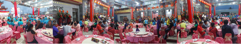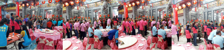 預計七點開始的平安宴,傍晚時分,就開始有友宮人士逐漸蒞臨,首先排隊進入主殿祭拜、上香,然後逐一落座,準備享受『平安宴』盛宴。緊接著是由陣頭、及舞獅掀開序幕,布置好的舞台,由主委及貴賓們、紛紛上台致詞,同時開始享用隆重的桌菜,將一天的隆重活動,化為輕鬆愉快的氣氛,再轉化為濃濃的情感、與信仰分享的喜悅,更讓『媽祖文化』的意義深入人心。
