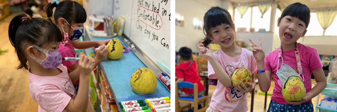 柚子是中秋節代表美食,也是傳承好幾代人的記憶,品嚐柚子同時也是反璞歸真的懷舊美食!今年『童心園幼兒園』用柚子來做造型創意畫,小朋友們自由發揮,展示自己的藝術天份,專注的神情、加上創作的喜悅,然後帶著自己的作品與同學們分享,讓柚子帶來更多趣味歡樂的聯想。另外還有『月餅』助興,在遊戲的體驗與期待中,今年的月餅特別好吃,原來美食也可以玩得很歡樂。