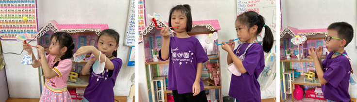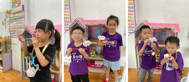 光是美食還不夠,平常看到高掛天上的月亮,今年來體驗『月亮起飛DIY』的遊戲。首先用『保麗龍絨』代表月亮,配合常見的吸管當素材,再把『保麗龍球』當做月亮,試著讓月亮起飛。看似簡單的遊戲,卻充滿夢幻的想像力,讓想朋友們盡情的發揮,作品完成後,再孩子們自己試著『月亮起飛DIY』演練,到處充滿驚奇的歡笑聲,孩子們玩著自己製作的玩具,紛紛樂在遊戲中。