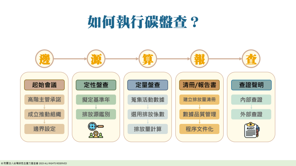 組織型碳盤查的五大步驟,分別是:邊、源、算、報、查。首先『邊』代表邊界設定、也就是盤查的範圍所在,其次『源』代表排放源鑑別、針對七種溫室氣體鑑定,第三『算』就是計算排放量,第四『報』是建立清冊、撰寫報告書,最後『查』是查驗證明。我國的合格查證機構,包括法國艾法諾、英國標準協會、SGS、德國萊茵技術監護顧問,都是國際級的合格認證機構。