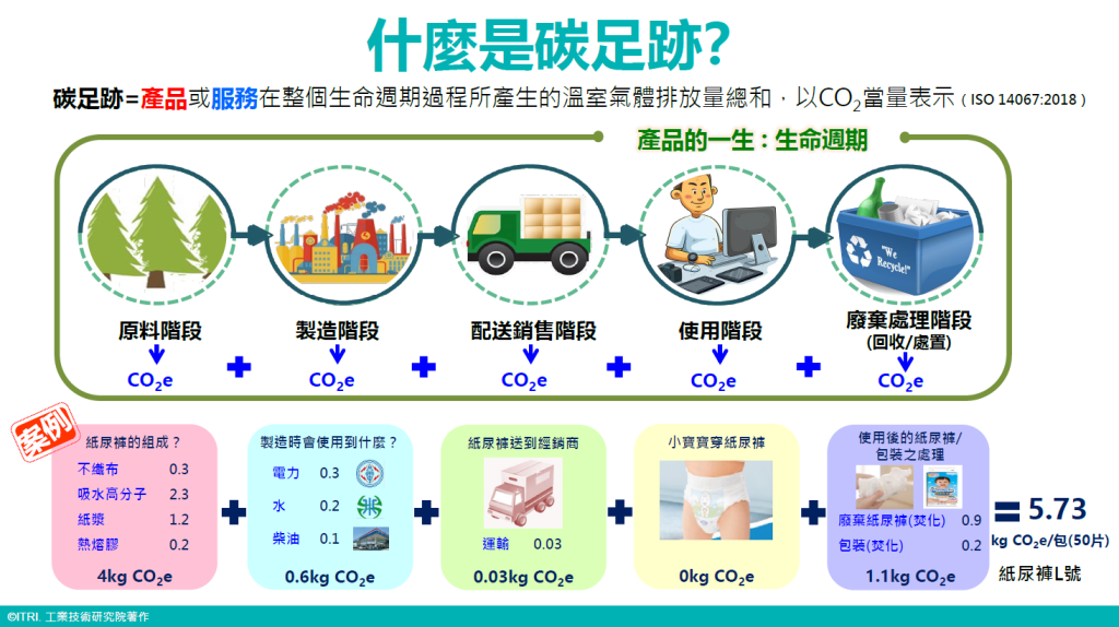 消費者較熟悉的是『產品碳足跡』。碳足跡是每一個功能單位(ex:每一瓶600ml礦泉水)產品或服務在生命週期所產生的溫室氣體排放量總和。從原料取得階段、產品製造階段、配送銷售階段、產品使用階段、及廢棄物處理階段所產生的碳排放量都要計算在內。基於對全球暖化的危機意識,消費者願意花較多的錢,購買『碳足跡』較低的產品,以維護地球生態環境,讓地球能夠永續使用。