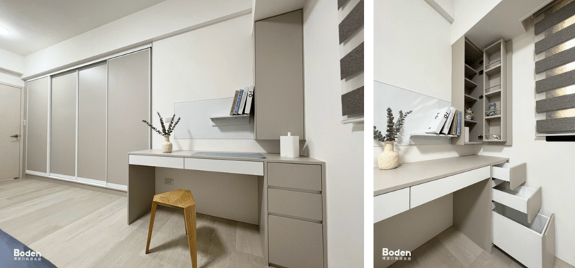 牆面後退,主臥室就變大了!極簡風設計,最難的是收納空間不好規劃。莊設計師發揮創意,採用推拉門,先讓衣物收藏方便;化妝台也有玄機,讓琳瑯滿目的化妝瓶,都有自己歸屬的家;配上多功能鋁框,擺設展示的禮物、紀念品,下方還有方便取用的置物空間,暨溫馨、又不會紊亂。唯有收納問題解決,主臥室才會有舒暢、方便的感覺。最後加上溫馨、柔和的配色,讓業主備感欣慰。
