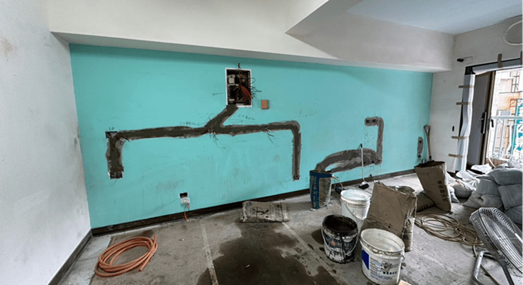 翻修過程必須非常嚴謹!從冷熱水管、到排水管的漏水,都要全部重新做防水層。尤其是蛇管重新佈線,根據預設的家具位置,如電視櫃、網路線…等,讓管線隱藏在牆壁後面,家電用品在後面的牆壁就有插座,自然顯得高雅俐落。博登名廚把明線變暗線,室內設計自然美觀。一般人只能將就,配合原有的管線與插座,再用延長線銜接,產生線路糾纏的混亂,不但不方便、更破壞美觀。