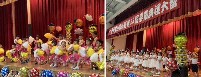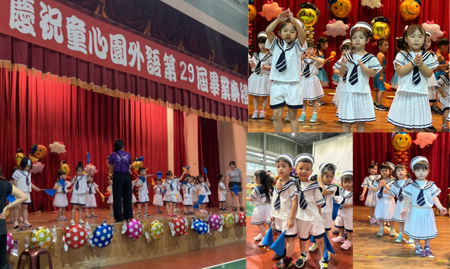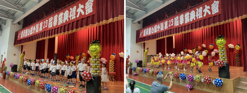 楠梓區『童心園幼兒園』秉持寓教於樂的精神,希望為畢業典禮留下值得回味的里程碑!全部會場佈置都是由老師們DIY構思、合力完成!再次展現老師們的設計與創意能力。同時安排,兩人一組的小朋友主持人,在台上全程用英文介紹表演的內容;再搭配一場場的精彩節目,夢幻、華麗的表演服飾,透過稚氣的臉龐,以及俐落的演出,家長們大呼過癮,更為孩子們的成長雀躍不已。
