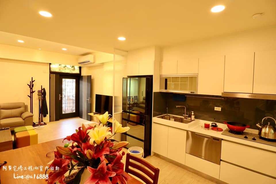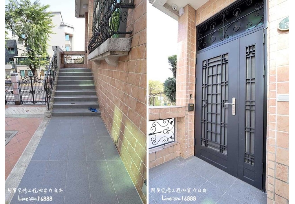 由於改修的主因,是漏水與壁癌,因此『阿賢宅修』著重基礎工程!從中庭的磁磚開始、就非常重視防水與美觀兼顧,玄關門片及浴室門片全面更新,並採用德國諾達超耐磨地板;客廳與廚房合一、空間更顯得寬敞,廚房也變得優雅大方、觀賞性十足,並自成完整的空間。從此華麗變身,成為時尚、新潮代言人。為確保住的品質維持長久,全式電線更新、與廚房單獨迴路,都全面換新。