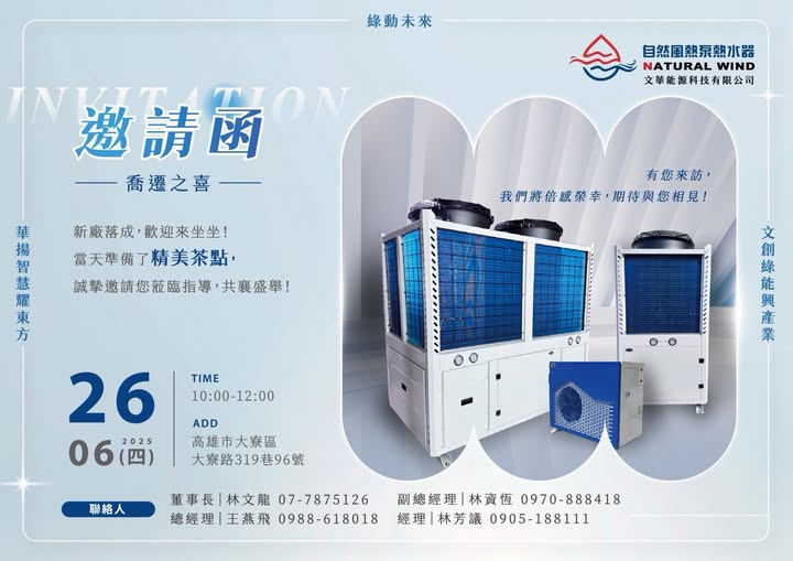隨著客戶需求增加,自然風『熱泵熱水器』也面臨擴廠、遷址的需求!於是選在2025年06月26日(星期四)早上10:00,喬遷到高雄市大寮區大寮路319巷96號。同時還有更多重要的品質提升計畫,正在籌備進行。新廠落成的喬遷當日,各界好友、廠商,匯集一堂,共襄盛舉!一邊享受精緻點心,一邊分享文華能源科技有限公司的轉型與蛻變過程,顯得充滿喜悅與熱鬧!